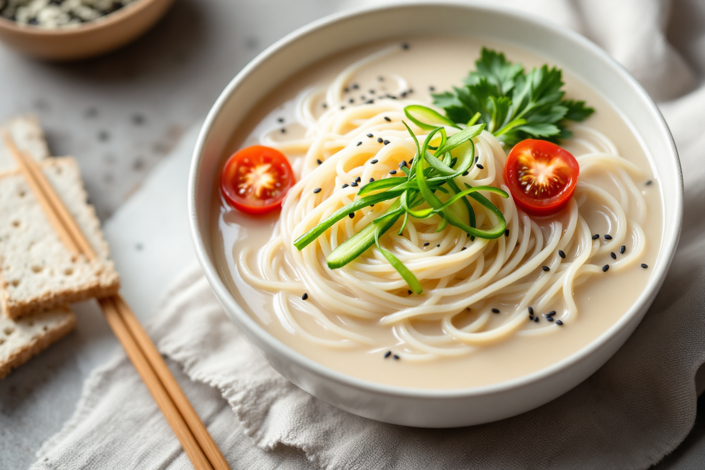 콩국수 맛있게 하는 비법은 고명에서도 빛을 발합니다. 채 썬 오이와 방울토마토는 필수 고명이에요. 오이는 아삭한 식감을, 방울토마토는 상큼한 맛을 더해줍니다. 여기에 깨소금을 솔솔 뿌리면 고소함이 배가됩니다.